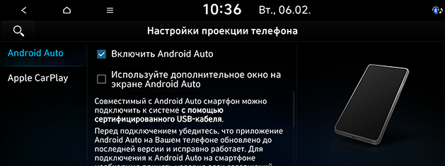 В этом меню приложения Android Auto и Apple CarPlay могут быть включены посредством установки соответствующего флажка.