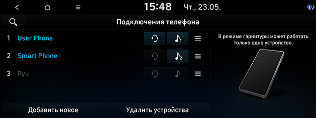 Содержит список сопряженных устройств Bluetooth. При выборе устройства в списке, оно либо подключается, либо отключается.