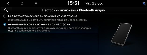Режим Bluetooth-аудио можно настроить на автоматическое включение при воспроизведении звука на подключенном телефоне. Даже если включен другой режим или все режимы мультимедиа отключены, при воспроизведении Bluetooth-аудио на телефоне режим мультимедиа автоматически переключается на Bluetooth-аудио, и вы можете управлять воспроизведением с телефона. Перед выполнением настроек убедитесь, что телефон сопряжен с информационно-развлекательной системой и подключен к ней.