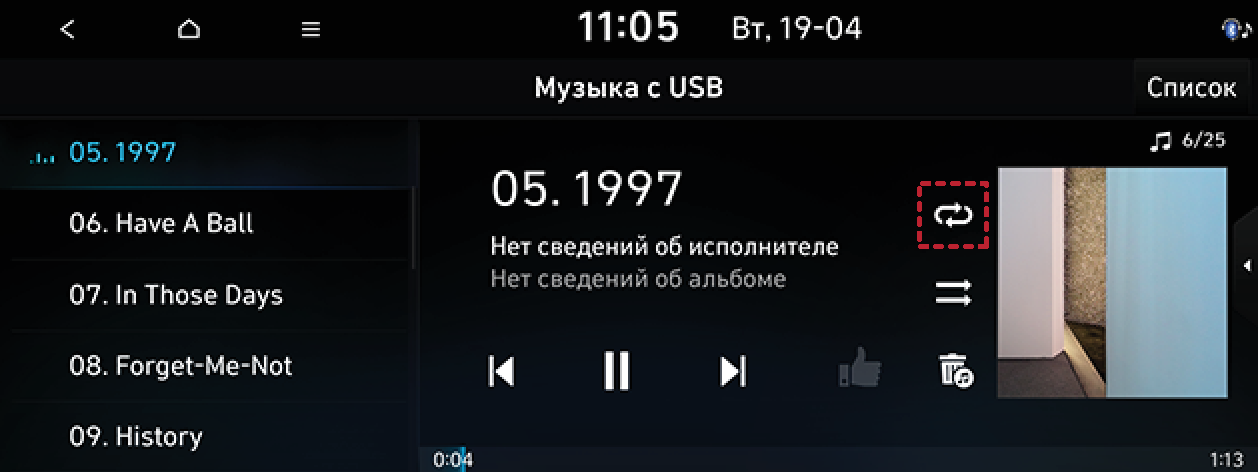 Файл, воспроизводящийся в данный момент, будет воспроизводиться циклически.