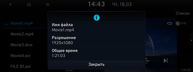 Эта функция позволяет просмотреть сведения о названии, разрешении и продолжительности воспроизведения файла.