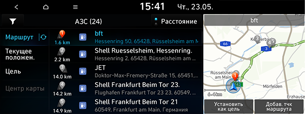 Текущее положен.: поиск заправочных станций поблизости от текущего местоположения автомобиля.