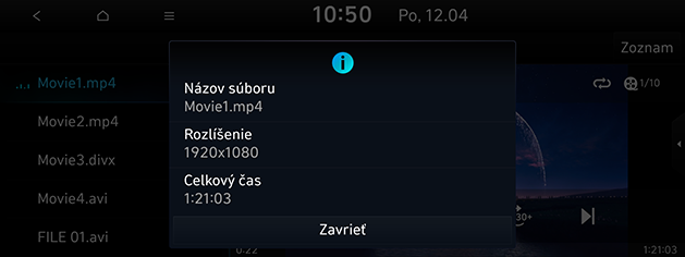 Táto funkcia zobrazí názov, rozlíšenie a čas prehrávania súboru.