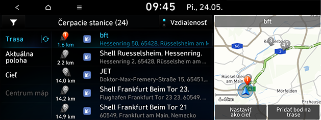 Trasa: Vyhľadá body záujmu pozdĺž aktuálnej trasy. Dostupné, len ak je nastavený cieľ.