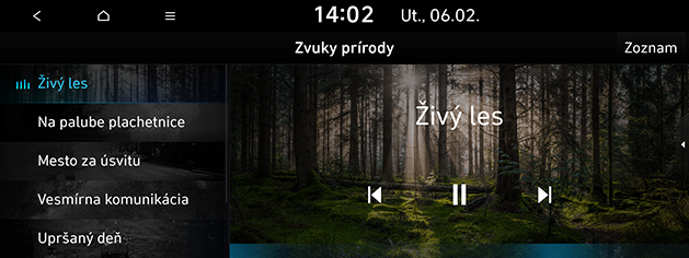 ] > Zdroje médií > Zvuky prírody alebo prepínajte cez tlačidlo MODE na volante. -