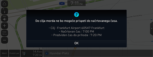Če je pri določitvi cilja in navigaciji poti ocenjeni čas prihoda kasnejši od podatka o uri sestanka, se bo odprl vodič, ki bo uporabniku sporočil, da bo morda prišlo do zamude.