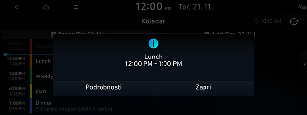 Uporabite funkcije Bluelink, kot so na primer Koledar, Vreme, Šport, Diagnostika vozila in nastavitve Bluelink. Funkcije Bluelink lahko uporabljate po aktivaciji storitve. Za uporabo storitve Bluelink bo morda treba plačati ločeno pristojbino, funkcije pa se lahko razlikujejo glede na vaš paket storitev.