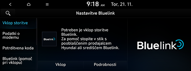 Vklop storitve: ta meni se uporablja za aktiviranje storitev Bluelink.