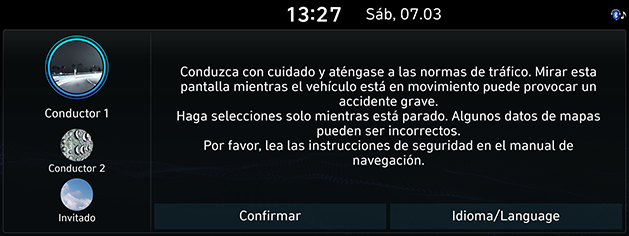 Pulse Confirmar después de seleccionar Conductor 1, Conductor 2 o Invitado. Para obtener información adicional, consulte la sección “Perfil”.