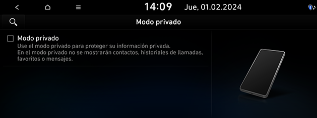 Puede establecer el modo privado para proteger sus datos personales. Los contactos, el historial de llamadas, los favoritos y los mensajes no se muestran cuando se activa el modo privado.
