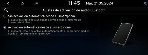 Puede configurar el modo de audio Bluetooth para que se active automáticamente cuando el teléfono conectado reproduzca audio. Aunque el otro modo esté activado o el modo multimedia esté desactivado, si reproduce audio Bluetooth en el teléfono, el modo multimedia cambia automáticamente al modo de audio Bluetooth para que pueda controlar la reproducción en el teléfono. Compruebe que su teléfono está emparejado y conectado al sistema de infoentretenimiento antes de configurarlo.
