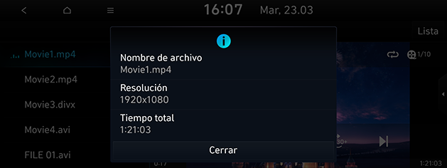 Esta función muestra información sobre el nombre, la resolución y el tiempo de reproducción del archivo.