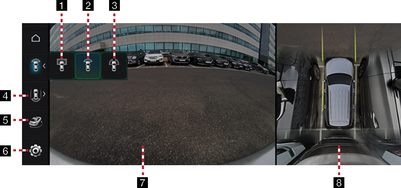 A través de 4 cámaras instaladas en el vehículo, puede ver el frente, la parte trasera y los dos lados.