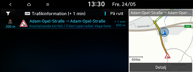 Aktuell trafik-/väghändelseinformation visas i trafikinformationslistan. Denna funktion kan komma att ej beaktas beroende på tillstånd.