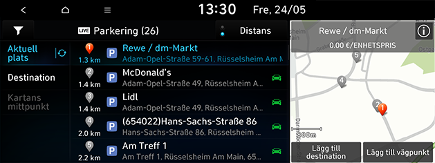 Du kan ställa in en parkeringsplats som destination med olika sökmetoder.