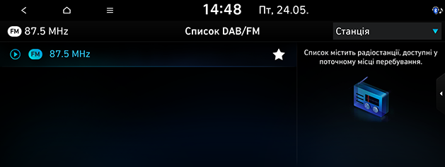 Можна переглянути список станцій з ідеальним рівнем сигналу. Натисніть Станції на екрані радіо.
