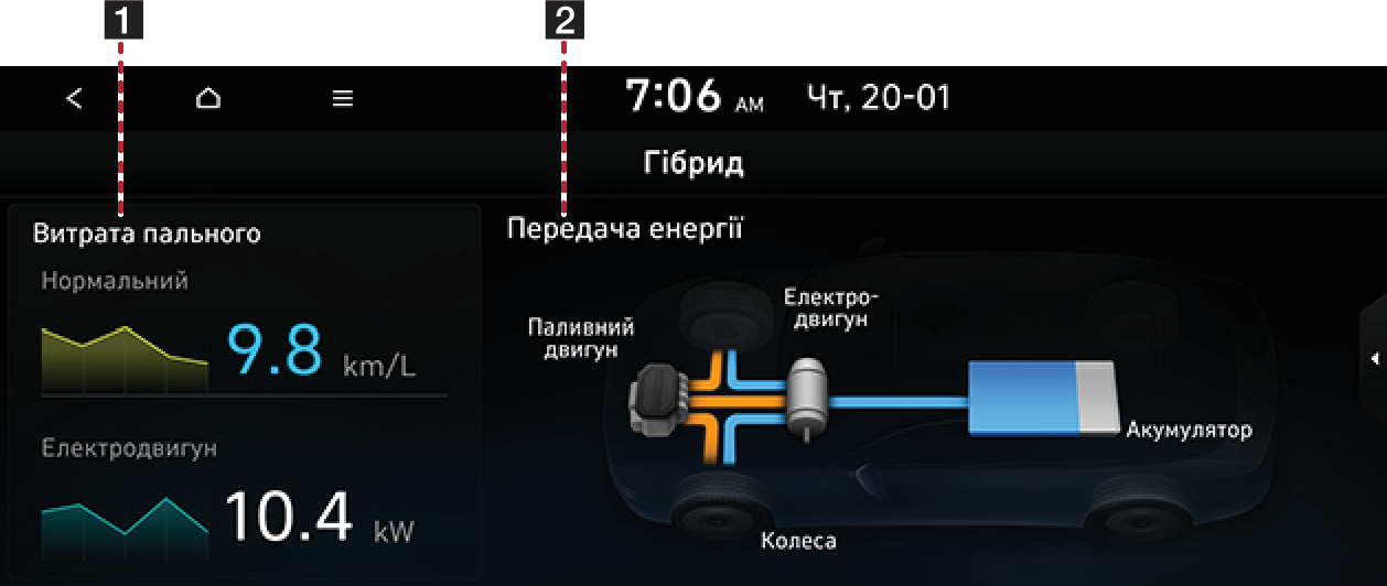 Меню гібрида складається з двох розділів: Витрата пального, Передача енергії.
