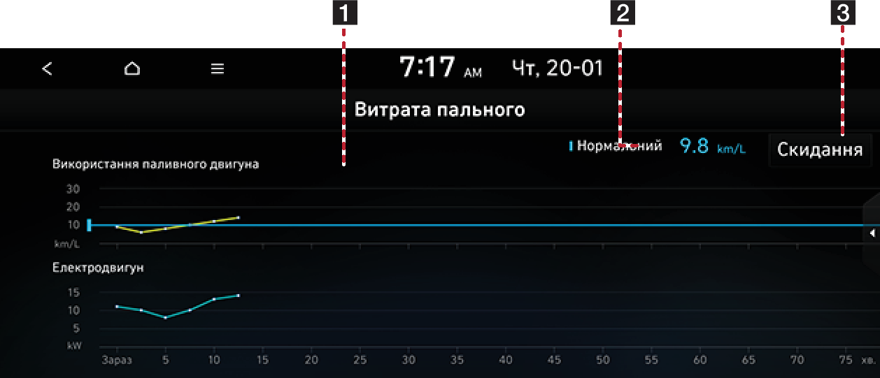 відображає інформацію економії пального. (Графік оновлюється кожні 2 хвилини 30 секунд.)