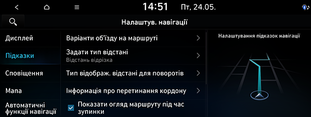 Натисніть SETUP > Навігація > Підказки.
