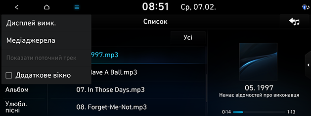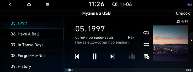 Екран перемикається на список із файлом, який зараз відтворюється.