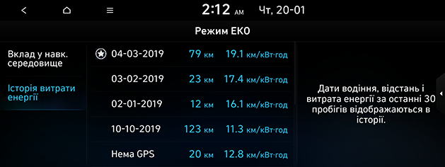 Відображає інформацію економії пального та попередню історію подорожей відповідно до руху автомобіля.