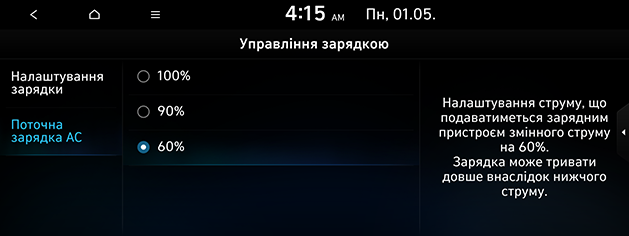 Можна налаштувати струм, який видає зарядний пристрій змінного струму, на 60%, 90% або 100%.