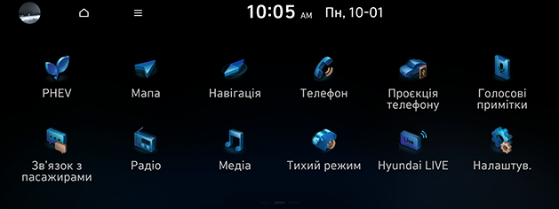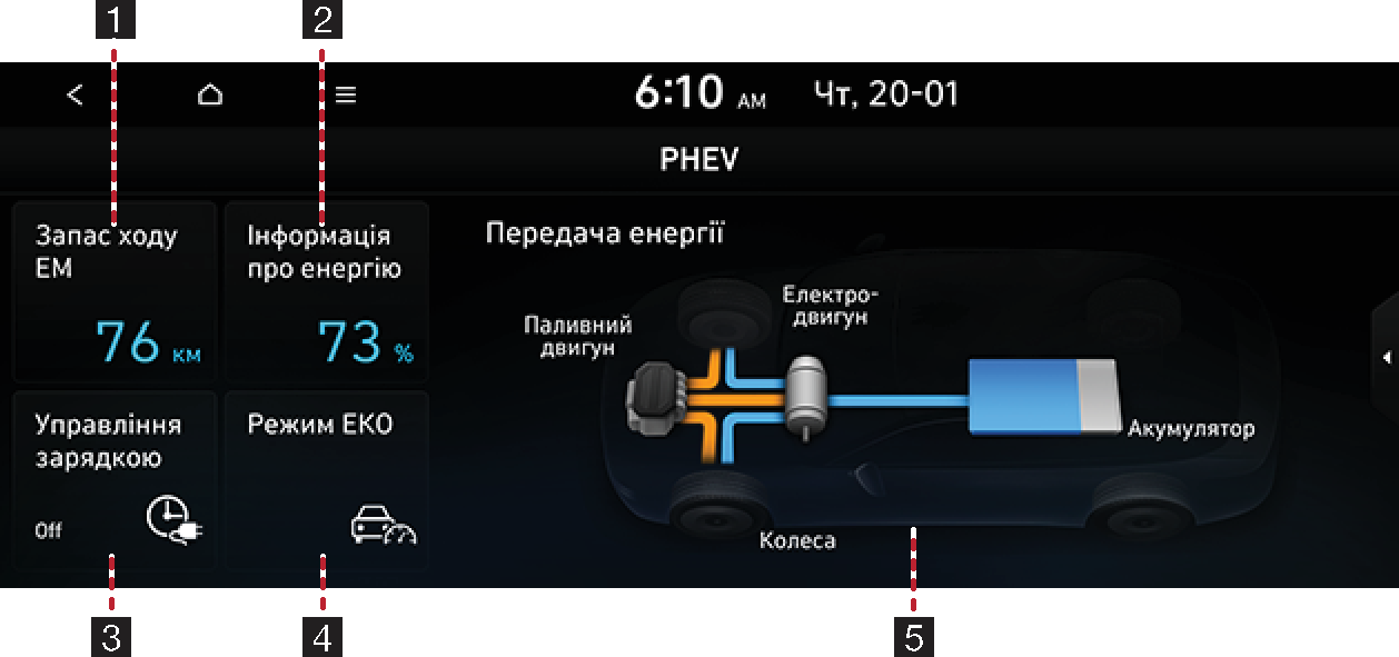 Меню гібрида з підзарядкою складається з п'яти розділів: Запас ходу ЕМ, Інформація про енергію, Управління зарядкою, Режим ЕКО, Передача енергії.
