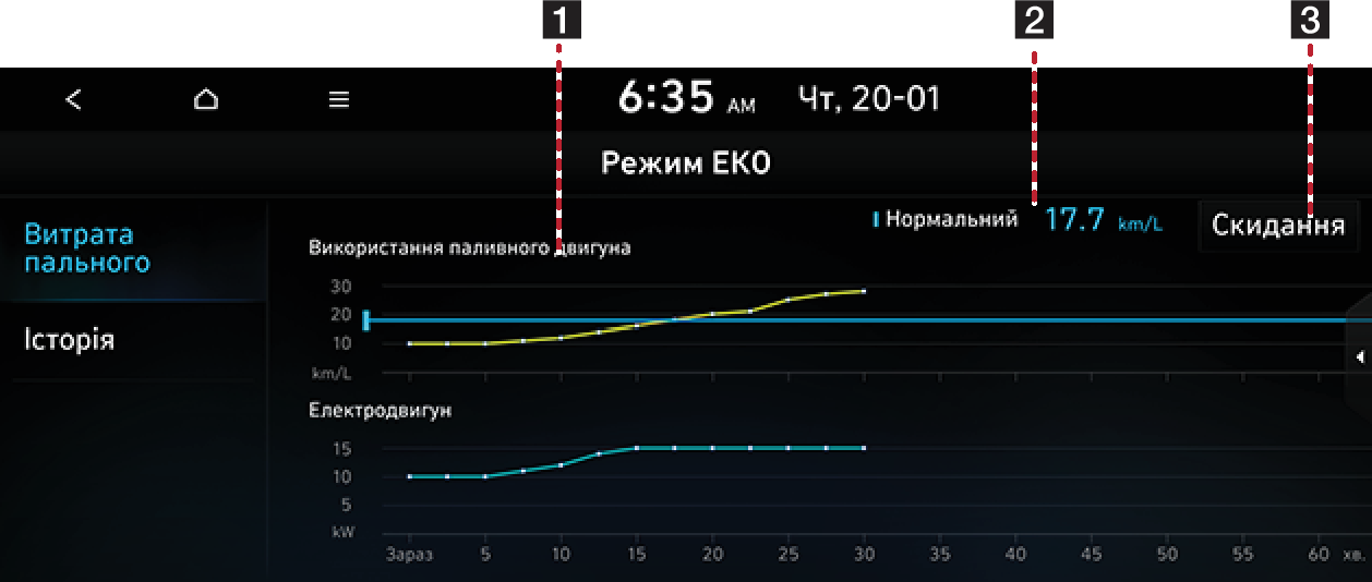 відображає інформацію економії пального. (Графік оновлюється кожні 2 хвилини 30 секунд.)