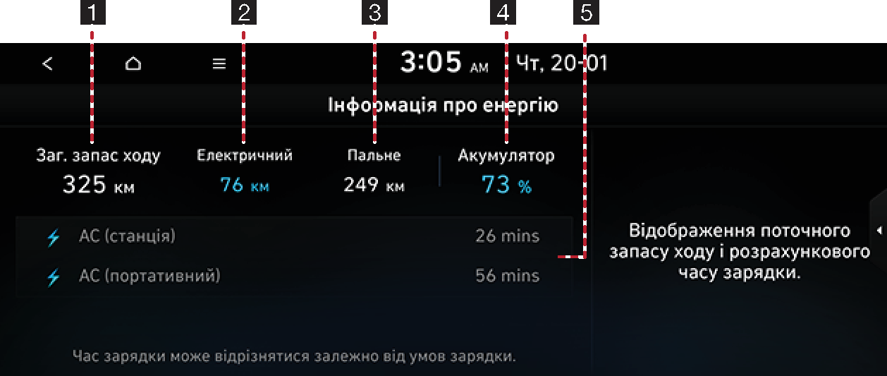 Відображає розрахунковий час заряджання після підключення зарядного кабелю.