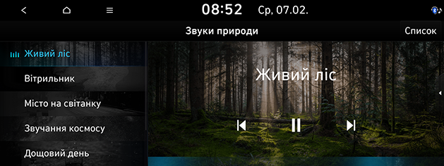] > Медіаджерела > Звуки природи, або перемикайте кнопкою MODE на кермі. -