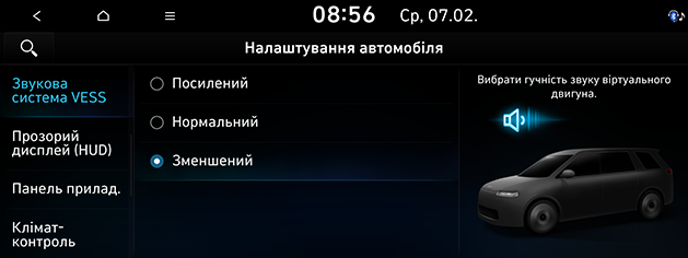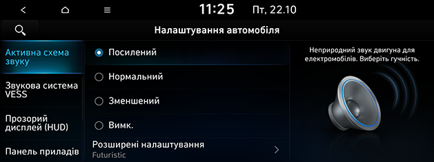 Виберіть потрібні елементи. Режим звуку двигуна можна встановити на Посилений, Нормальний, Зменшений або Вимк..