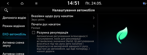 Натисніть SETUP > Автомобіль > ЕКО-автомобіль.