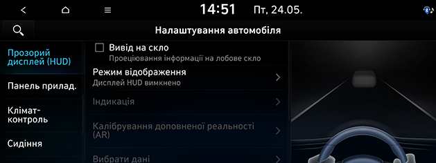 Натисніть SETUP > Автомобіль > Прозорий дисплей (HUD).