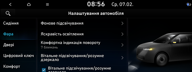 Натисніть SETUP > Автомобіль > Фара.
