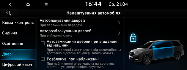 Автоблокування дверей: налаштування умов для автоматичного блокування всіх дверей. Можна вибрати Активувати у випадку руху, При перемиканні передачі, Активувати при перемиканні передачі на R, N або D або Вимк..