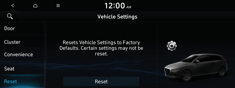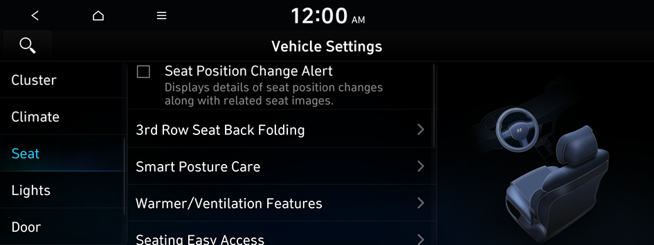 You can set to use various features (motions and warmer control for the driver’s seat, rear seat, and steering wheel) that are related to the seats and steering wheel.
