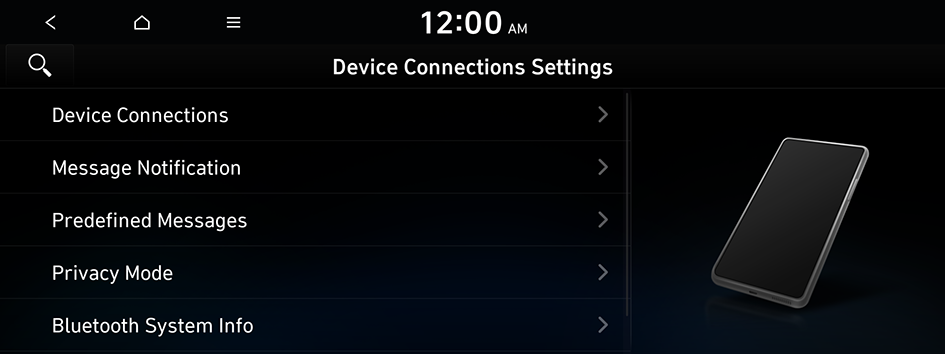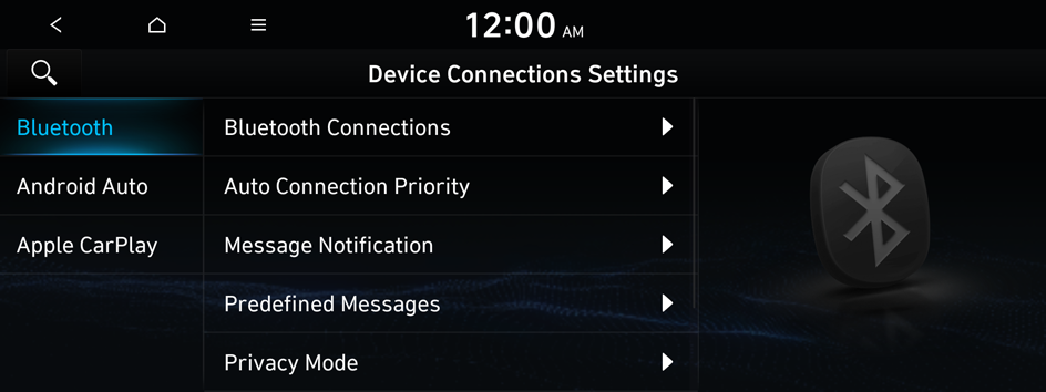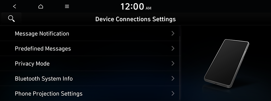 and enter a keyword to search for a setting item.You can manage Bluetooth devices or configure their operation settings. You can also activate the phone projection so that you can control the smartphone Apps on the system screen after connecting the smartphone to the system.