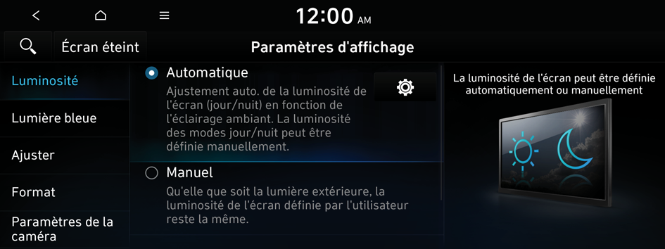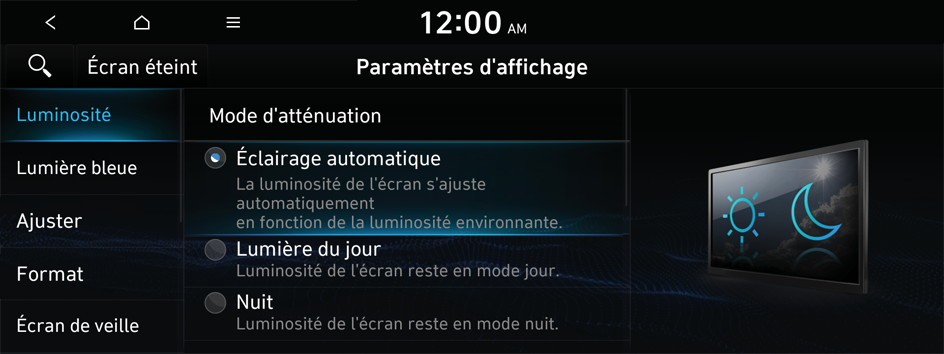 , puis saisissez un mot clé pour rechercher un paramètre.Vous pouvez ajuster automatiquement la luminosité de l'écran selon la lumière ambiante. Vous pouvez également le régler afin que l'écran reste lumineux ou sombre. Vous pouvez ajuster automatiquement la luminosité de l'écran selon l'éclairage du tableau de bord. Vous pouvez également régler le niveau de luminosité de l'écran à utiliser pendant la journée ou en mode nuit.
