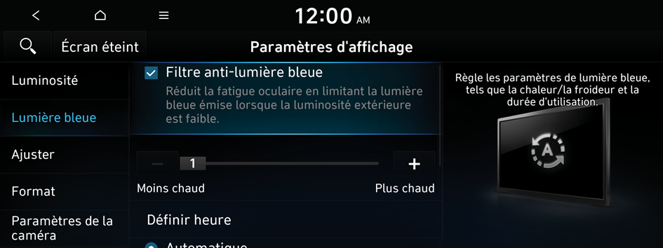 À configurer pour activer automatiquement le filtrage de la lumière bleue en fonction de la lumière ambiante ou choisir la plage horaire manuellement.