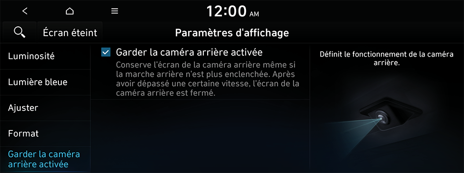 Vous pouvez régler le système pour qu'il affiche la caméra arrière lorsque vous placez le levier de vitesse dans une autre position que « R » (marche arrière) après une marche arrière.