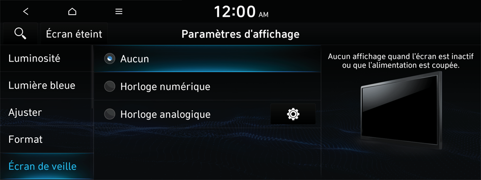 Affiche l'horloge dans le format analogique sur l'écran de veille du système.