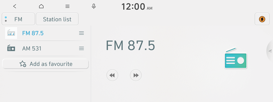 The radio screen provides various functions while listening to radio broadcasts.