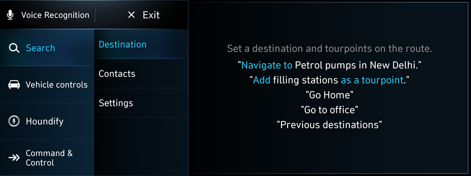 Navigate to POI | फ़िलिंग स्टेशन {ढूँढें}. | You can search for a designated category of POIs nearby. For example, say "Navigate to Agra" |