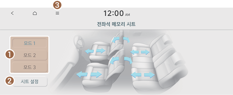- 주행 중에는 시트를 조절하여 저장하거나 저장된 시트를 불러올 수 없습니다. 정차한 후에 시트를 변경하세요.