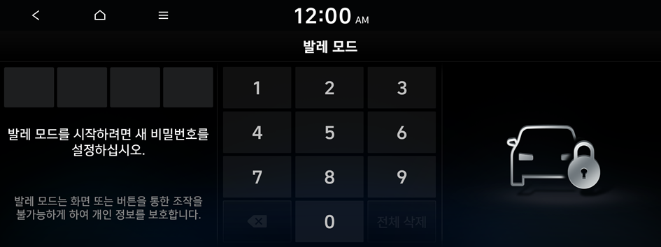 - 비밀번호를 5회 이상 잘못 입력할 경우 시스템에서 발레 모드를 해제할 수 없습니다. 발레 모드를 해제하려면 블루링크 앱에서 발레 모드 비밀번호를 초기화하거나 블루링크 센터(1800-108-5000)로 문의하세요.