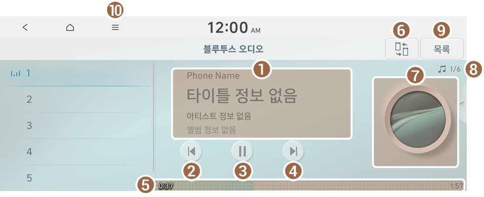 블루투스로 연결된 오디오 기기에서 음악 파일을 재생하면 다음과 같은 음악 플레이어가 실행됩니다.