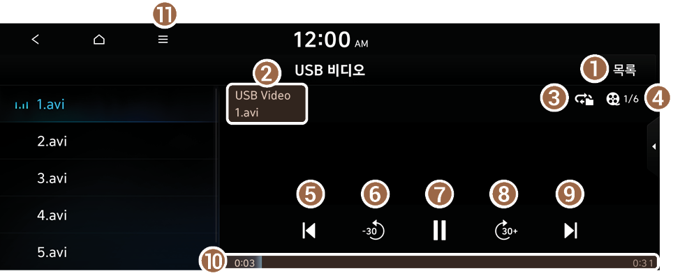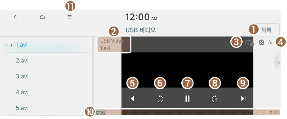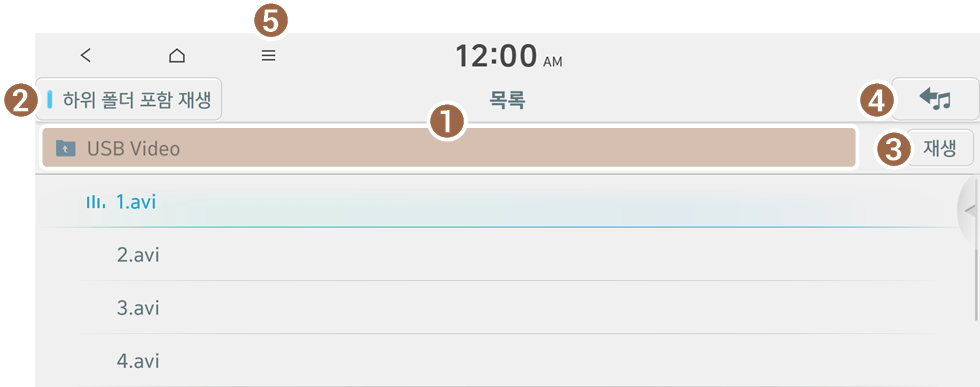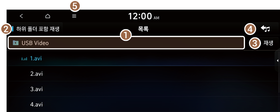 USB 동영상 화면에서 목록을 누르면 목록 화면에서 원하는 동영상을 검색하여 재생할 수 있습니다.