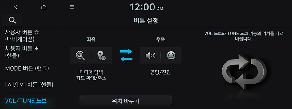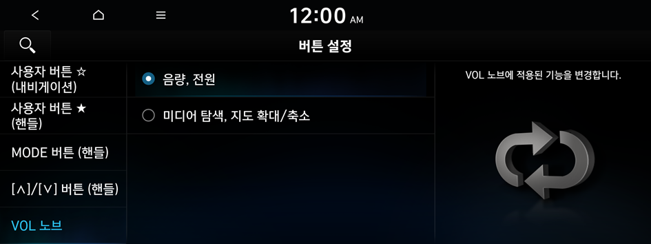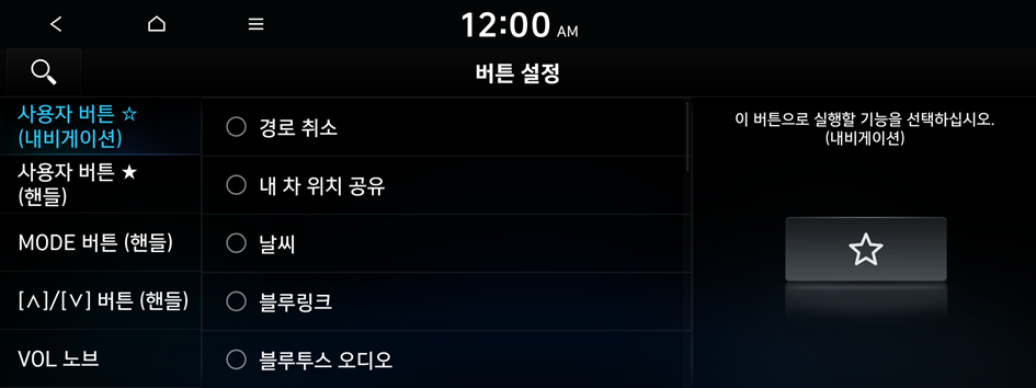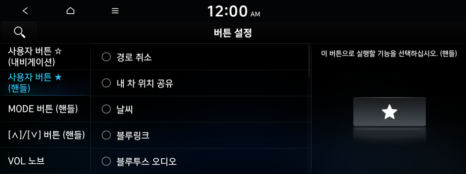 자주 사용하는 기능을 사용자 버튼 기능으로 설정하면 편리합니다. 설정하려면 스티어링 휠의 사용자 버튼을 길게 누르고 목록에 표시된 기능을 선택합니다.