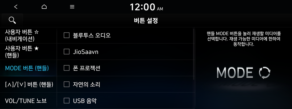 MODE 버튼은 반복해서 누르면 자주 사용하는 미디어 모드를 변경할 수 있습니다. 실행하려면 스티어링 휠의 MODE 버튼을 길게 누른 다음 자주 사용하는 모드를 표시된 목록에서 선택합니다.