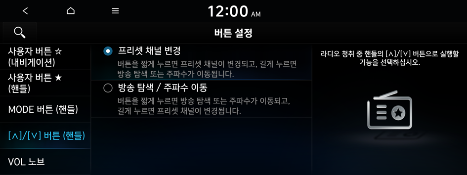 스티어링 휠에서 이동 레버를 사용해 실행할 라디오 기능을 선택할 수 있습니다.